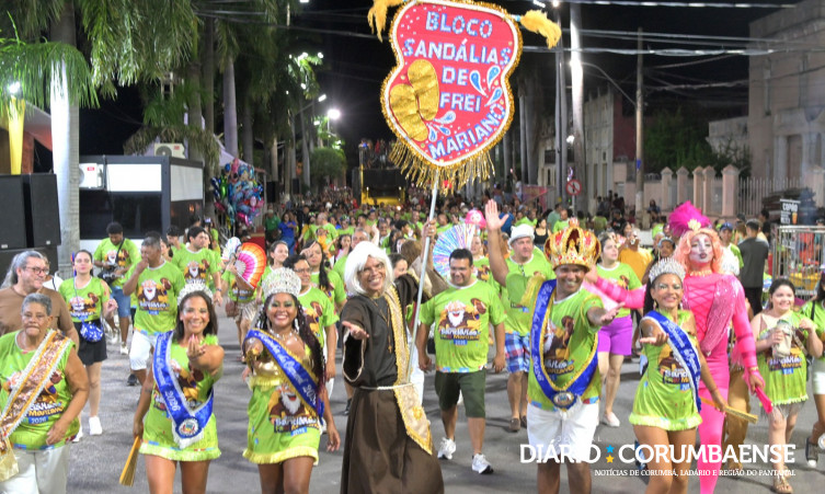 Criado em 2006, pela então presidente da Fundação de Cultura, Heloísa Urt (falecida em 2011), o bloco Sandálias de Frei Mariano foi uma forma de brincar com uma das lendas mais fortes do Pantanal sul-mato-grossense, as sandálias do Frei Mariano que, acusado de não pagar o relógio da igreja que acabara de construir, em 1887, vingou-se rogando uma praga contra os moradores de Corumbá.